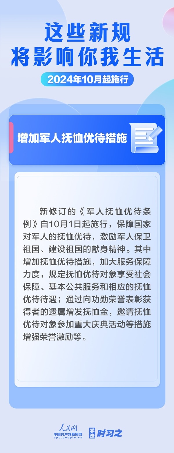增加軍人撫恤優(yōu)待措施;全鏈條規(guī)范養(yǎng)老機(jī)構(gòu)收費(fèi)行為;電動(dòng)自行車用鋰電池實(shí)施強(qiáng)制性產(chǎn)品認(rèn)證……10月起,這些新規(guī)施行,將影響你我生活。