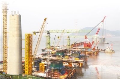 西堠門公鐵兩用大橋墩身施工現場。弋鵬麗攝
