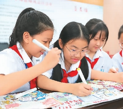 浙江省臺州市路橋區(qū)螺洋小學(xué)的學(xué)生繪制網(wǎng)絡(luò)安全宣傳手抄報(bào)。蔣友青攝(人民視覺)