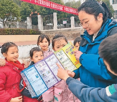在湖南省江永縣實(shí)驗(yàn)小學(xué),該縣農(nóng)商銀行工作人員為小學(xué)生宣講網(wǎng)絡(luò)金融知識。潘百旺攝(人民視覺)