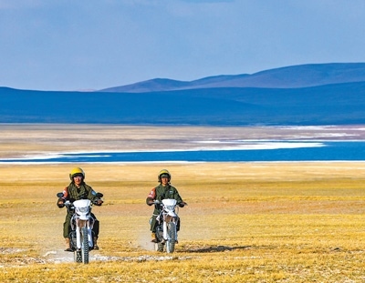 扎西羅布(左)和同事騎車(chē)巡邏。