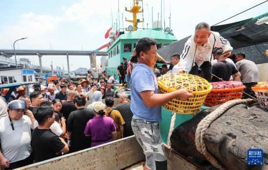 當(dāng)日,在浙江省舟山市普陀區(qū)舟山國(guó)際水產(chǎn)城碼頭,出海的漁船歸來(lái),商戶們聞“鮮”而至。工人把卸下來(lái)的梭子蟹運(yùn)往水產(chǎn)城內(nèi),準(zhǔn)備銷往各地市場(chǎng)。
