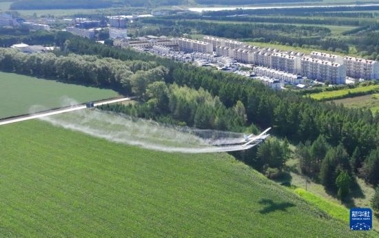 8月2日,農(nóng)用飛機在北大荒集團黑龍江尖山農(nóng)場有限公司農(nóng)業(yè)科技服務(wù)中心玉米田噴施葉面肥(無人機照片)。