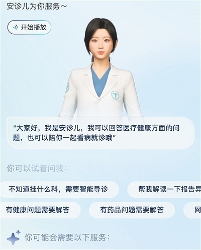 57歲的沈阿姨因?yàn)轭^疼到浙江省人民醫(yī)院就診。在她的手機(jī)屏幕上,一位身著白大褂、長(zhǎng)相甜美的數(shù)字醫(yī)生“安診兒”正在為她提供幫助。