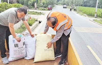 麟游縣農(nóng)村公路發(fā)展服務(wù)中心養(yǎng)護(hù)工(右)在幫助群眾裝糧食。楊雅芳攝