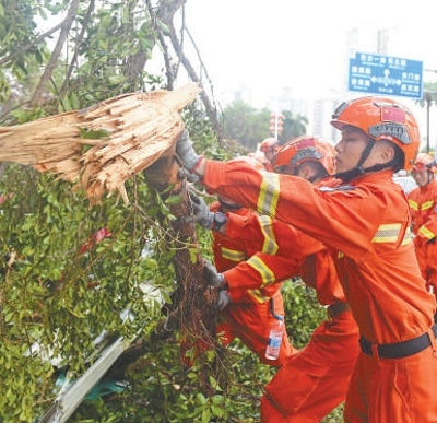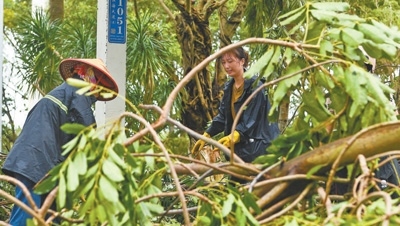 9月7日,海南省??谑泄ぷ魅藛T在??谑袨I海大道上清理被風吹倒的樹木。新華社記者 楊冠宇攝