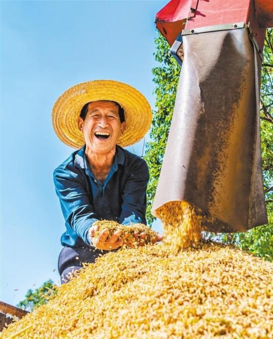 10月10日,湖南省東安縣紫溪市鎮(zhèn)中心村,農(nóng)民在高標(biāo)準(zhǔn)農(nóng)田收獲晚稻。今年前三季度,全國夏糧早稻產(chǎn)量合計(jì)17795萬噸,比上年增加346萬噸,增長2.0%。蔡小平攝(中經(jīng)視覺)