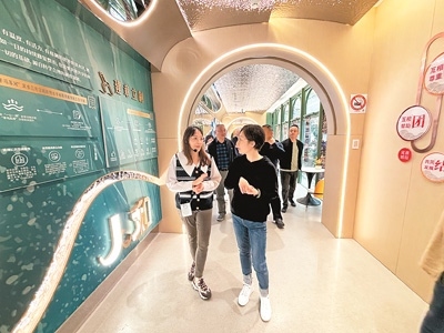 工作人員在“半馬蘇河驛站·1690黨群服務(wù)中心”向參觀者介紹蘇州河沿岸環(huán)境綜合整治提升情況。本報(bào)記者 李 貞攝