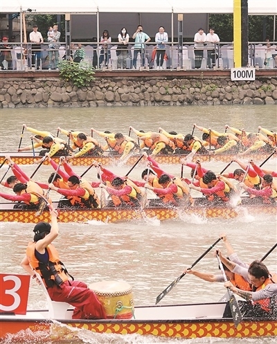 6月1日,第二十屆上海蘇州河城市龍舟邀請(qǐng)賽比賽現(xiàn)場(chǎng),選手在激烈比拼。馬偉勤攝(人民視覺)