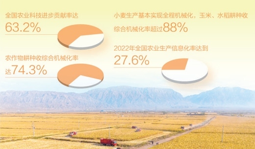 農(nóng)機(jī)為糧食生產(chǎn)護(hù)航,豐收更添底氣。目前,北斗導(dǎo)航大馬力拖拉機(jī)、氣力式高速精量播種機(jī)、乘坐式插秧機(jī)、植保無(wú)人機(jī)、玉米籽粒聯(lián)合收獲機(jī)等新型農(nóng)機(jī)廣泛應(yīng)用。全國(guó)農(nóng)業(yè)科技進(jìn)步貢獻(xiàn)率達(dá)63.2%,農(nóng)作物耕種收綜合機(jī)械化率達(dá)74.3%,小麥生產(chǎn)基本實(shí)現(xiàn)全程機(jī)械化,玉米、水稻耕種收綜合機(jī)械化率超過(guò)88%。