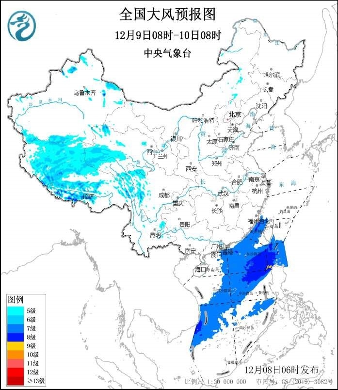 預(yù)計,12月8日08時至9日08時,西藏中西部、青海西南部、川西高原、新疆北部等地部分地區(qū)將有5~6級風,西藏中西部和青海西南部局地風力可達7~8級;東海大部、臺灣海峽、臺灣以東洋面、巴士海峽、南海北部、中部和西南部海域、北部灣將有7~8級、陣風9級的大風,其中臺灣海峽部分海域的風力可達9級、陣風10級。