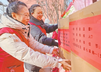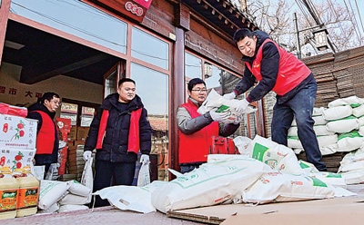 山東省青州市,工作人員將走訪慰問(wèn)困難群眾的愛心年貨裝車。