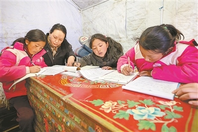 西藏自治區(qū)日喀則市薩迦縣普村的安置點(diǎn)內(nèi),黨員次央(左二)在輔導(dǎo)村里的小朋友寫作業(yè)。