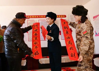遼寧省朝陽(yáng)市龍城區(qū)聯(lián)合鎮(zhèn)長(zhǎng)立哈達(dá)村,朝陽(yáng)軍分區(qū)官兵給幫扶老年人送春聯(lián)。