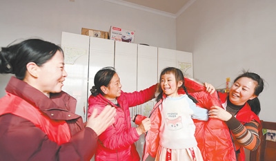 安徽省金寨縣燕子河鎮(zhèn)張畈村,志愿者在困難群眾家里幫助孩子試穿新衣服。