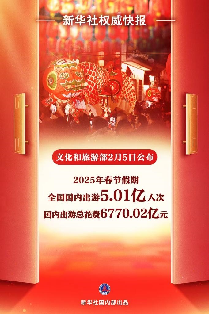 文化和旅游部2月5日公布2025年春節(jié)假期文化和旅游市場(chǎng)情況。經(jīng)文化和旅游部數(shù)據(jù)中心測(cè)算,春節(jié)假期8天,全國(guó)國(guó)內(nèi)出游5.01億人次,同比增長(zhǎng)5.9%;國(guó)內(nèi)出游總花費(fèi)6770.02億元,同比增長(zhǎng)7.0%。