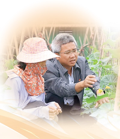 海南三亞市育才生態(tài)區(qū)那受村,駐村第一書記肖春雷(右)指導(dǎo)農(nóng)戶種植黃瓜。