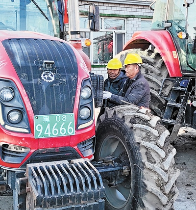 農(nóng)機(jī)庫(kù)里,社員程傳寶蹲在拖拉機(jī)旁仔細(xì)檢查,反復(fù)確認(rèn)有沒有漏油,或者零件松動(dòng)。