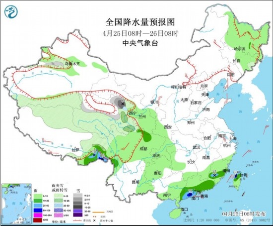 4月25日08時至26日08時,新疆沿天山地區(qū)和南疆南部、西藏北部和東部、青海大部、甘肅南部、川西高原北部等地部分地區(qū)有小到中雪或雨夾雪,局地有大雪(5~8毫米)。西藏東南部、四川盆地西北部、云南西北部、福建中南部、廣東南部、臺灣島北部等地部分地區(qū)有中到大雨,其中,西藏東南部、廣東西南部、臺灣島西北部等地部分地區(qū)有暴雨(50~75毫米)。內蒙古中東部、黑龍江東部、遼寧大部、江蘇南部、西藏南部、川西高原北部等地部分地區(qū)有4~5級風;東海大部海域、臺灣海峽有5~7級風,陣風8級。