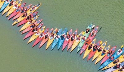 4月25日,重慶市南川區(qū)黎香湖鎮(zhèn)黎香湖皮劃艇基地,游客們在湖里體驗(yàn)水上運(yùn)動(dòng)樂趣。據(jù)介紹,“五一”假期期間該皮劃艇基地已預(yù)約滿員。