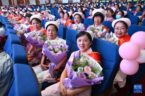 5月9日在內(nèi)蒙古自治區(qū)婦幼保健院學(xué)術(shù)報告廳拍攝的接受表彰的護士們。