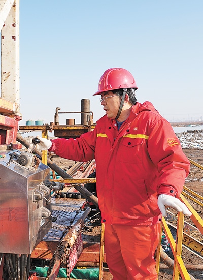 趙增權(quán)在油井操作平臺(tái)檢修儀器設(shè)備。