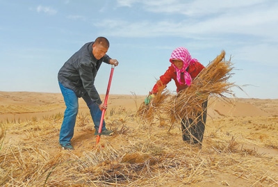 先做壓沙草方格。挖開(kāi)方方正正的草方格,在四邊鋪上麥草,踩著鐵鍬,把麥草從間隙里壓進(jìn)去……一次次重復(fù),換來(lái)一排排麥草挺立,穩(wěn)住了片片流沙。