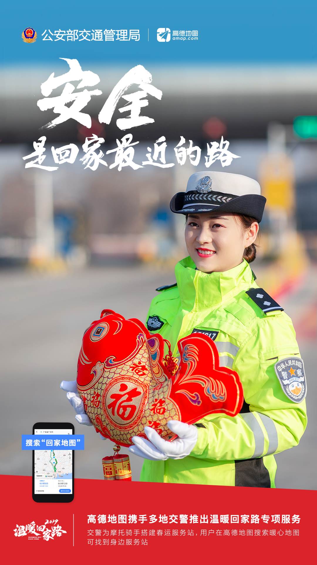 為做好2019年春運(yùn)保障工作,特別是發(fā)動(dòng)社會(huì)力量做好交通安全社會(huì)協(xié)同治理,廣東、廣西、福建、江西、湖北、云南、安徽、四川、湖南等春運(yùn)重點(diǎn)省、自治區(qū)交警總隊(duì)聯(lián)合高德地圖啟動(dòng)2019年春運(yùn)“溫暖回家路”專項(xiàng),推出“回家地圖”系列在線服務(wù),通過“交警+科技”結(jié)合,助力人民群眾安全返鄉(xiāng)。同時(shí),與人民日報(bào)社、新華社、中央廣播電視總臺(tái)等媒體,以及中廣聯(lián)合會(huì)、中國交通頻道等機(jī)構(gòu)和微博、秒拍、一直播等新媒體平臺(tái)聯(lián)動(dòng),共同開展2019年春運(yùn)交通安全宣傳工作。