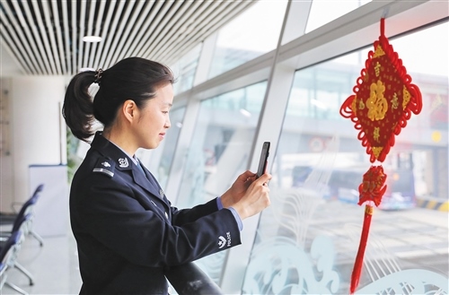 2月6日,青島機(jī)場出入境邊防檢查站女子旅檢科民警馮哲利用工作間隙與遠(yuǎn)在老家的兒子視頻通話。解豪攝(新華社發(fā))
