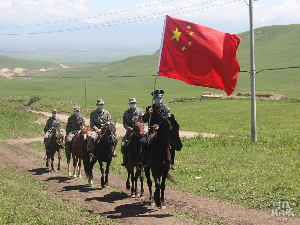 △新疆伊犁昭蘇縣洪土溝邊境檢查站民警和護邊員在邊境線踏查。