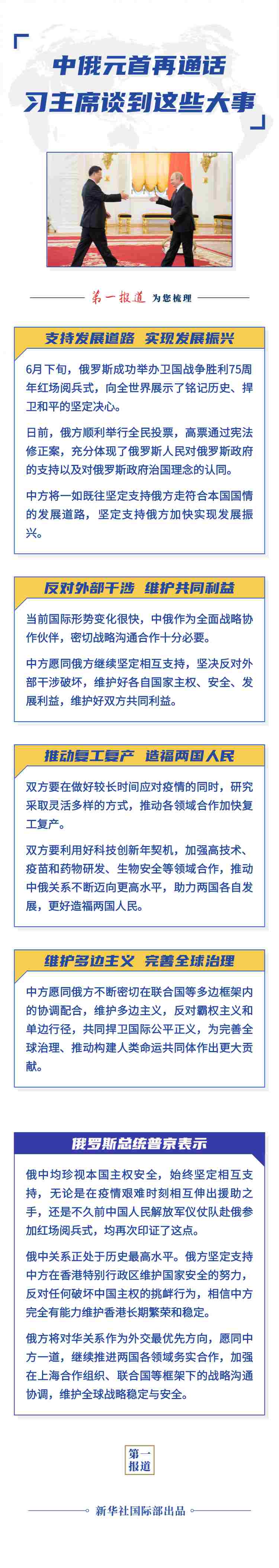習近平指出,6月下旬,俄羅斯成功舉辦衛(wèi)國戰(zhàn)爭勝利75周年紅場閱兵式,向全世界展示了銘記歷史、捍衛(wèi)和平的堅定決心。日前,俄方順利舉行全民投票,高票通過憲法修正案,充分體現了俄羅斯人民對俄羅斯政府的支持以及對俄羅斯政府治國理念的認同。中方將一如既往堅定支持俄方走符合本國國情的發(fā)展道路,堅定支持俄方加快實現發(fā)展振興。