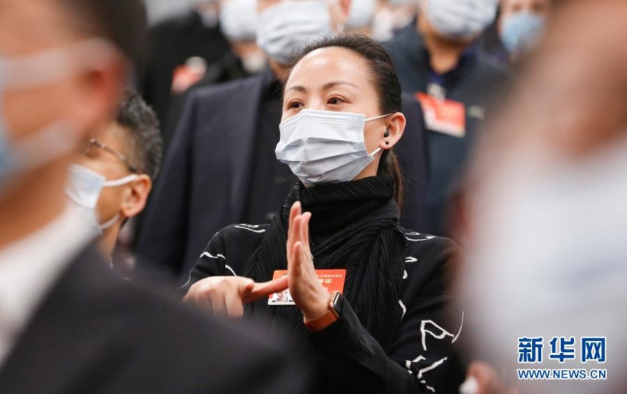 3月5日,第十三屆全國(guó)人民代表大會(huì)第四次會(huì)議在北京人民大會(huì)堂開幕。這是列席大會(huì)的全國(guó)政協(xié)委員、中國(guó)殘疾人藝術(shù)團(tuán)團(tuán)長(zhǎng)邰麗華用手語(yǔ)“唱”國(guó)歌。新華社記者 張玉薇 攝