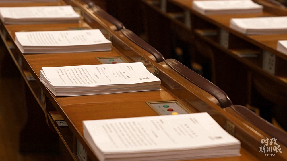△擺放在代表座位上的政府工作報(bào)告等文件(總臺(tái)央視記者彭漢明拍攝)