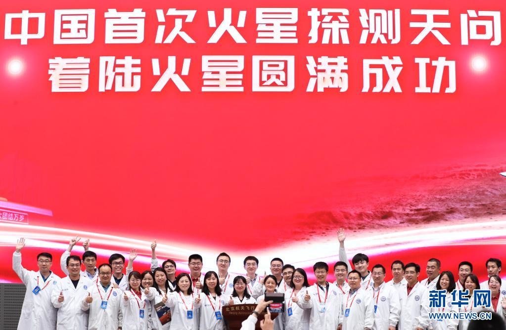 2021年2月10日,在北京航天飛行控制中心指揮大廳,航天科研人員慶祝我國(guó)首次火星探測(cè)任務(wù)天問(wèn)一號(hào)環(huán)繞火星成功。新華社記者 金立旺 攝
