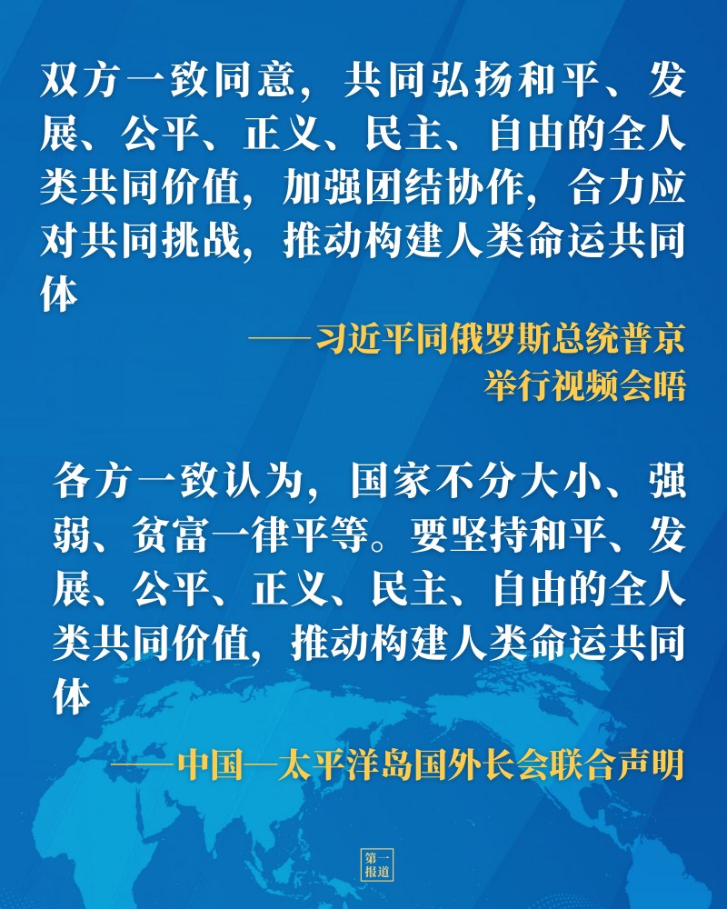 從同普京總統(tǒng)視頻會晤、同菲律賓總統(tǒng)杜特爾特通電話,到第七十屆聯(lián)合國大會一般性辯論、世界經(jīng)濟(jì)論壇“達(dá)沃斯議程”對話會、中國共產(chǎn)黨與世界政黨領(lǐng)導(dǎo)人峰會等多邊場合,習(xí)近平主席多次闡述全人類共同價(jià)值的深刻內(nèi)涵,凝聚中外共識。