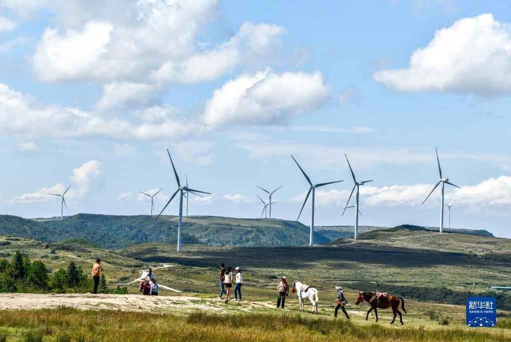 游客在貴州省龍里縣龍里大草原的風電場觀光(9月21日攝)。新華社記者 楊文斌 攝