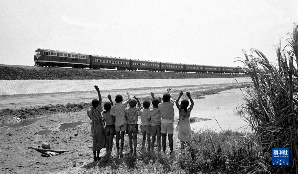 贊比亞魯西瓦西湖畔的少年兒童歡迎坦贊鐵路的列車通到他們的家鄉(xiāng)(1976年攝)。新華社發(fā)
