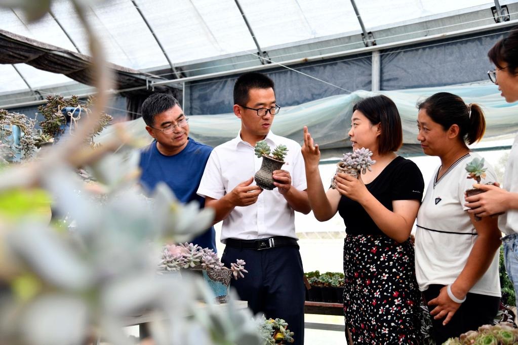 2020年6月9日,在濟(jì)南市章丘區(qū)三澗溪村農(nóng)業(yè)創(chuàng)業(yè)園,青年創(chuàng)業(yè)黨支部書(shū)記王元虎(左二)和青年黨員一起商量發(fā)展事宜。新華社記者王凱攝
