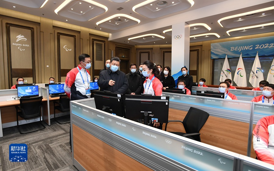 1月4日,中共中央總書記、國家主席、中央軍委主席習近平在北京考察2022年冬奧會、冬殘奧會籌辦備賽工作。這是4日下午,習近平在北京冬奧運行指揮部調(diào)度中心考察。新華社記者 謝環(huán)馳 攝
