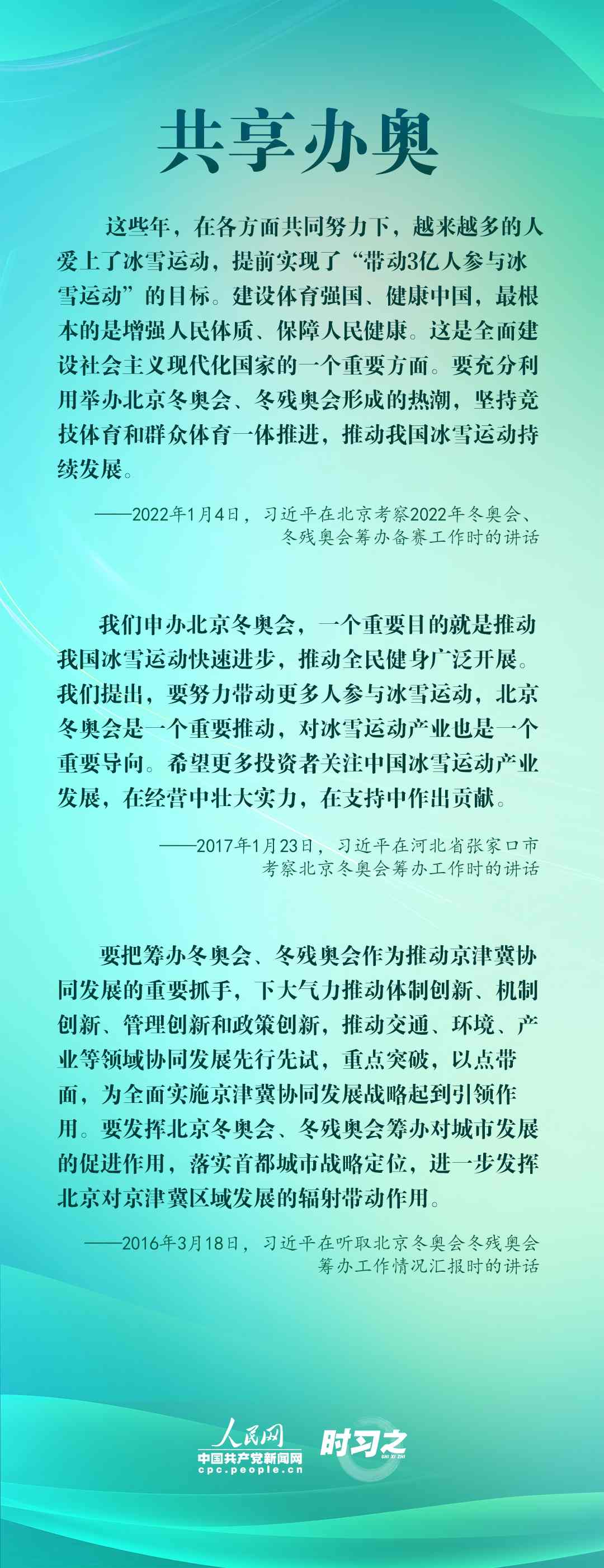 1月4日,習近平在北京考察2022年冬奧會、冬殘奧會籌辦備賽工作,指出“要堅持綠色辦奧、共享辦奧、開放辦奧、廉潔辦奧的理念,突出科技、智慧、綠色、節(jié)儉特色”。辦好北京冬奧會、冬殘奧會,是中國向國際社會作出的莊嚴承諾。習近平多次調(diào)研并強調(diào)綠色、共享、開放、廉潔的辦奧理念。