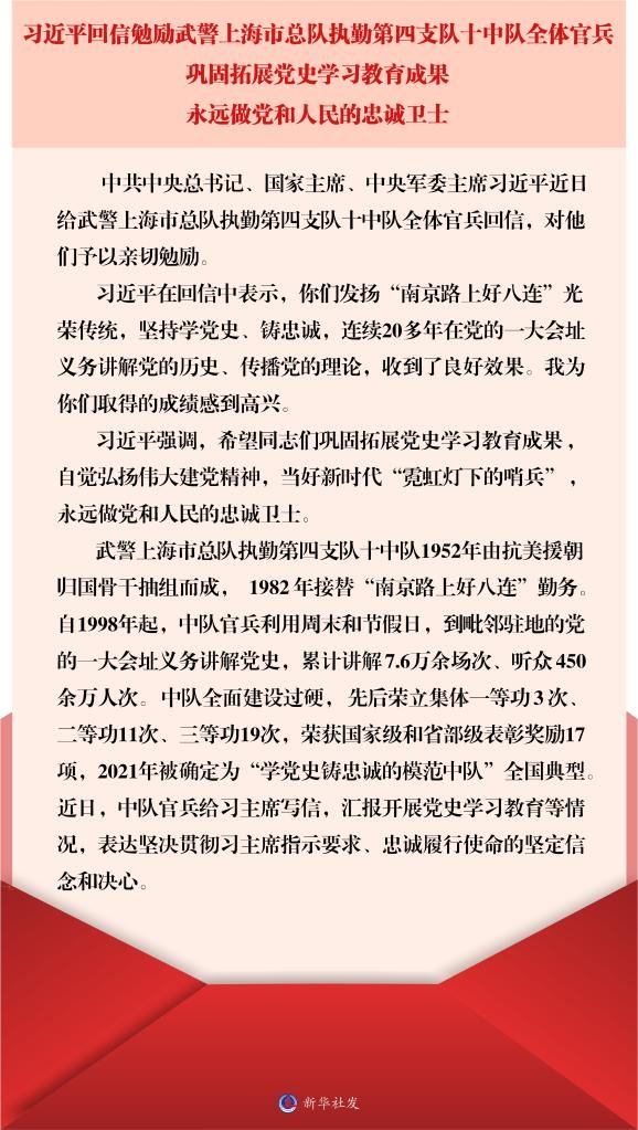 武警上海市總隊執(zhí)勤第四支隊十中隊1952年由抗美援朝歸國骨干抽組而成,1982年接替“南京路上好八連”勤務(wù)。自1998年起,中隊官兵利用周末和節(jié)假日,到毗鄰駐地的黨的一大會址義務(wù)講解黨史,累計講解7.6萬余場次、聽眾450余萬人次。中隊全面建設(shè)過硬,先后榮立集體一等功3次、二等功11次、三等功19次,榮獲國家級和省部級表彰獎勵17項,2021年被確定為“學(xué)黨史鑄忠誠的模范中隊”全國典型。近日,中隊官兵給習(xí)主席寫信,匯報開展黨史學(xué)習(xí)教育等情況,表達(dá)堅決貫徹習(xí)主席指示要求、忠誠履行使命的堅定信念和決心。