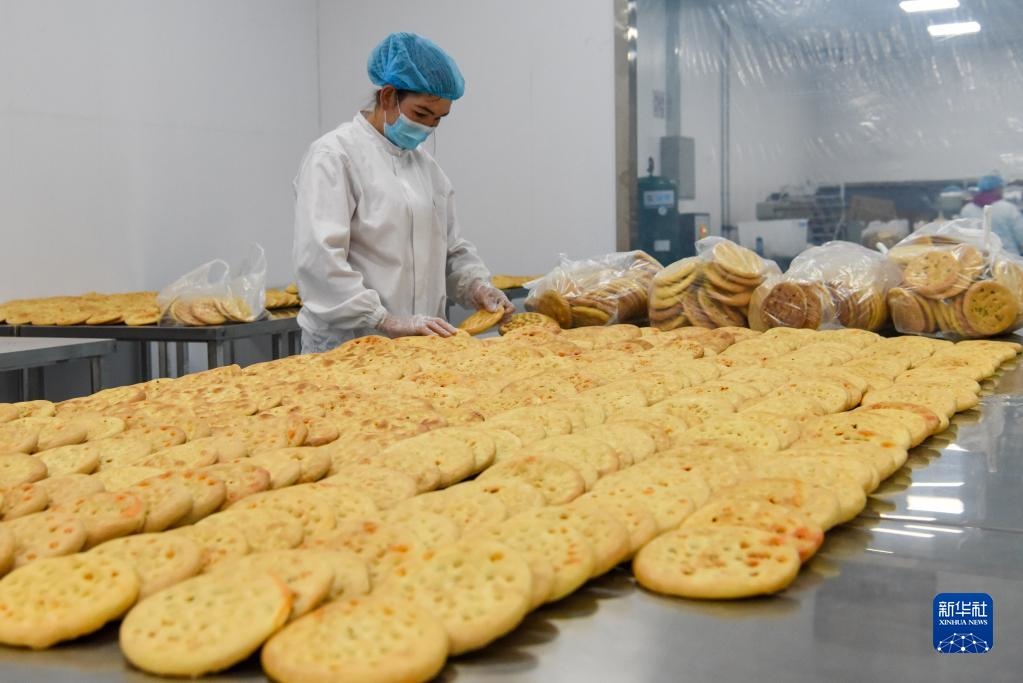 在新疆霍爾果斯馕產業(yè)園,工作人員在分揀剛做好的馕(2021年2月5日攝)。新華社記者 丁磊 攝