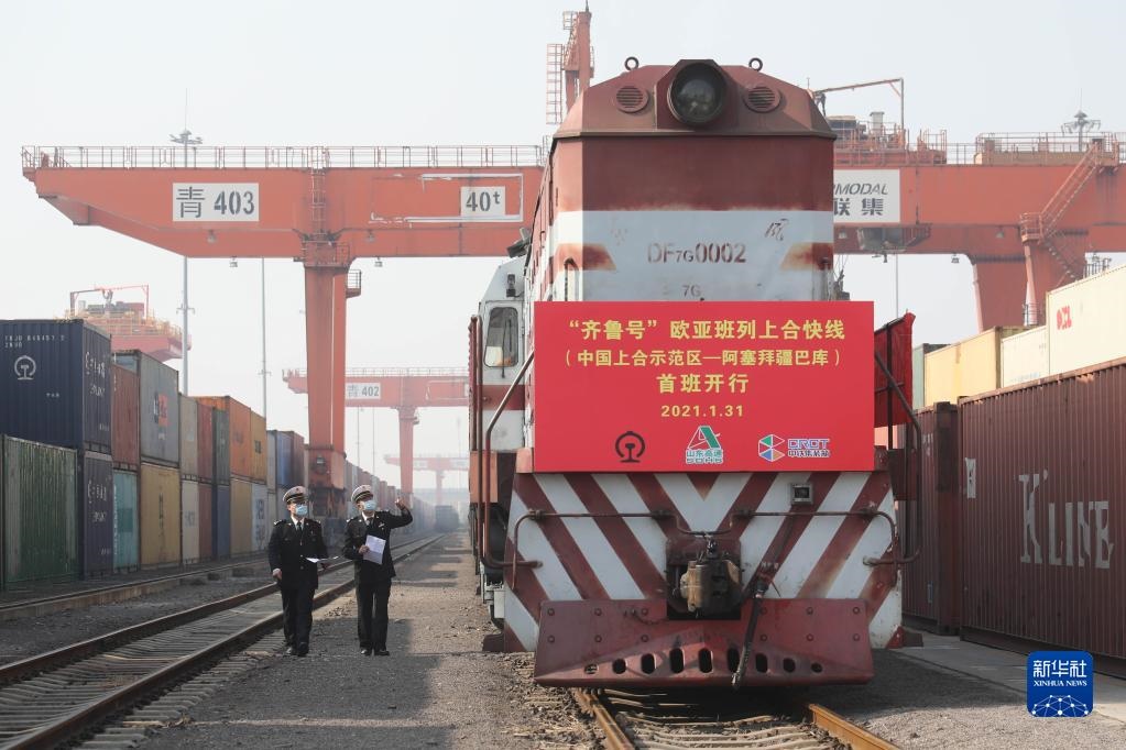 膠州海關(guān)關(guān)員對“齊魯號”歐亞班列上合快線(中國上合示范區(qū)——阿塞拜疆巴庫)線路首班列車進(jìn)行檢查(2021年1月31日攝)。新華社發(fā)(解豪攝)