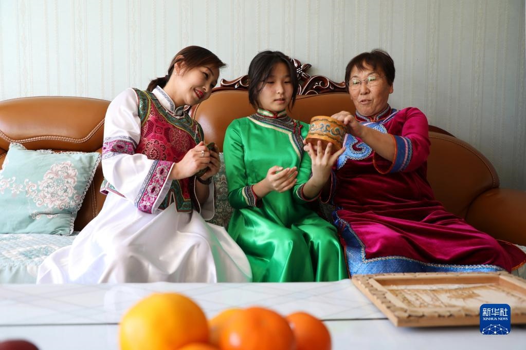 10月17日,內(nèi)蒙古莫力達瓦達斡爾族自治旗布西社區(qū)居民杜文娟(左)和家人在一起。新華社記者 鄒儉樸 攝