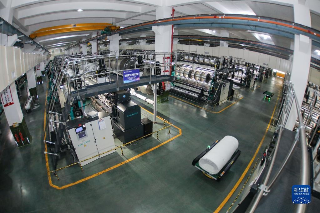 福建晉江,華宇錚鎣集團第五經(jīng)編車間內(nèi),一排排經(jīng)編機正在高速運轉,AGV物流機器人不停穿梭其中。
