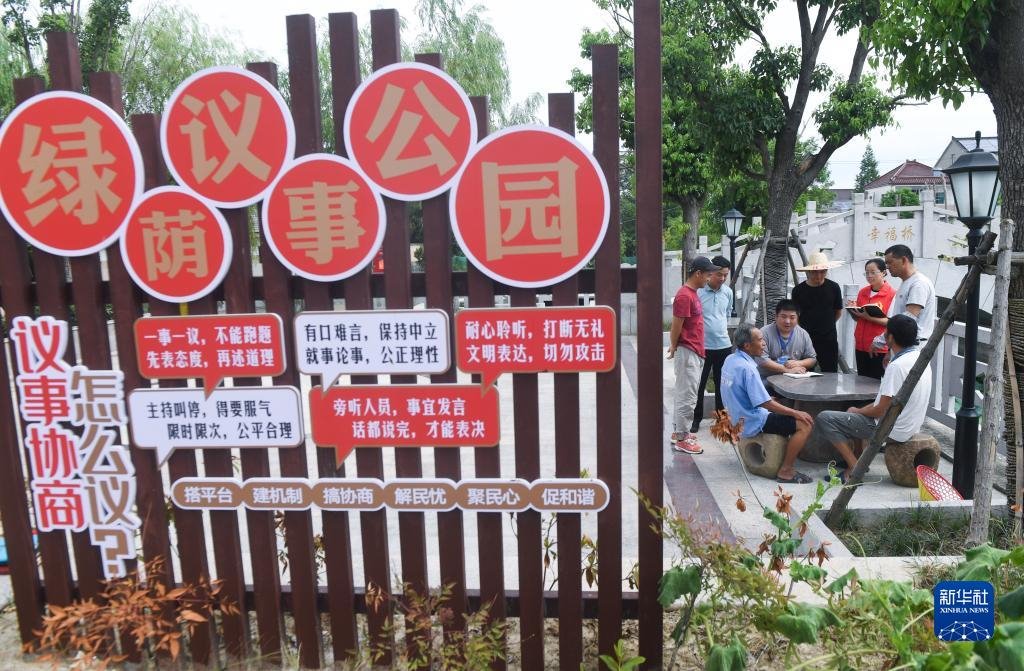 在浙江省湖州市長興縣呂山鄉(xiāng)龍溪村的議事公園內(nèi),田園議事會(huì)成員開展討論協(xié)商(2022年7月21日攝)。新華社記者 徐昱 攝