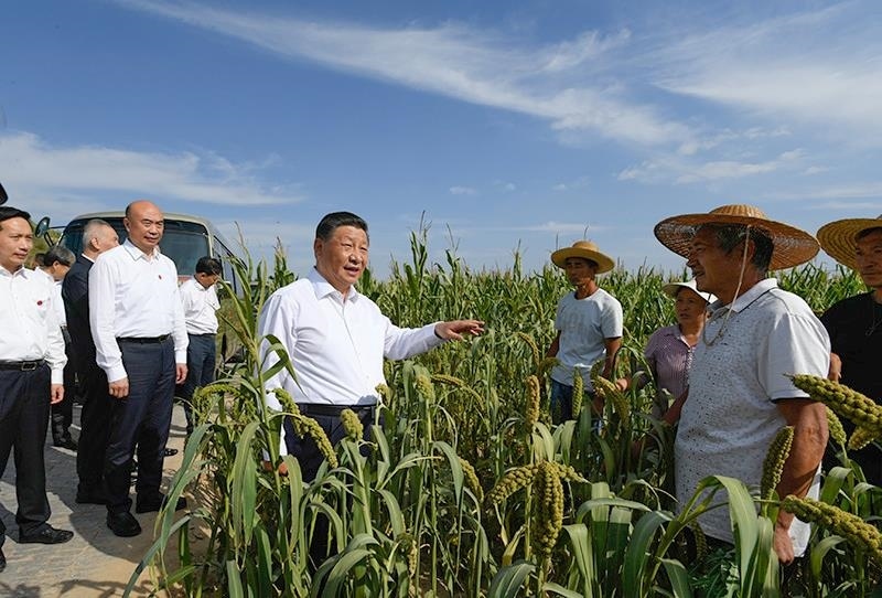 △2021年9月13日,習(xí)近平總書記在陜西米脂縣高西溝村臨時(shí)下車,察看糧食作物長勢,同正在田間勞作的老鄉(xiāng)拉家常。