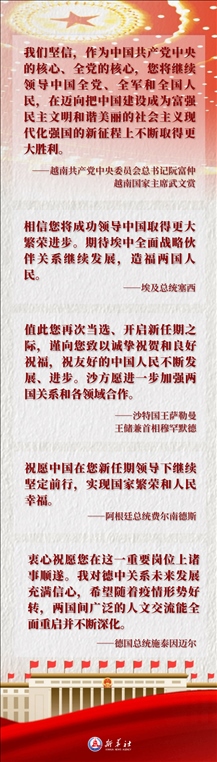 多國(guó)領(lǐng)導(dǎo)人在賀電賀函中表達(dá)他們對(duì)習(xí)近平全票當(dāng)選的祝賀與敬佩之情。