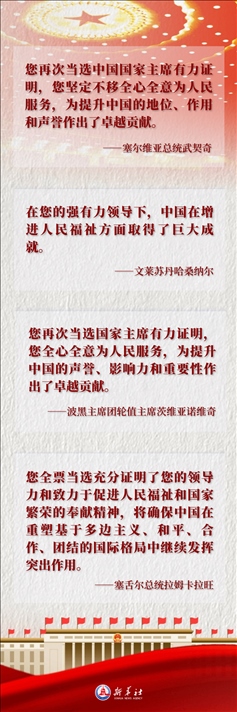 塞爾維亞總統(tǒng)武契奇表示,您再次當(dāng)選中國(guó)國(guó)家主席有力證明,您堅(jiān)定不移全心全意為人民服務(wù),為提升中國(guó)的地位、作用和聲譽(yù)作出了卓越貢獻(xiàn)。