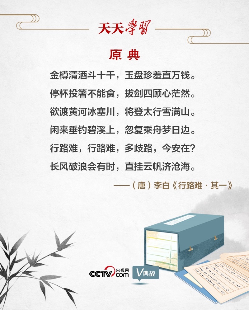 “行路難”為樂(lè)府古題,多詠嘆世路艱難及貧困孤苦的處境。李白的《行路難》共三首,“長(zhǎng)風(fēng)破浪會(huì)有時(shí)”出自第一首。唐天寶元年(742年),李白奉詔入京,擔(dān)任翰林供奉。后因權(quán)臣讒毀排擠,被“賜金放還”?!缎新冯y》便是李白離開(kāi)長(zhǎng)安時(shí)所作。